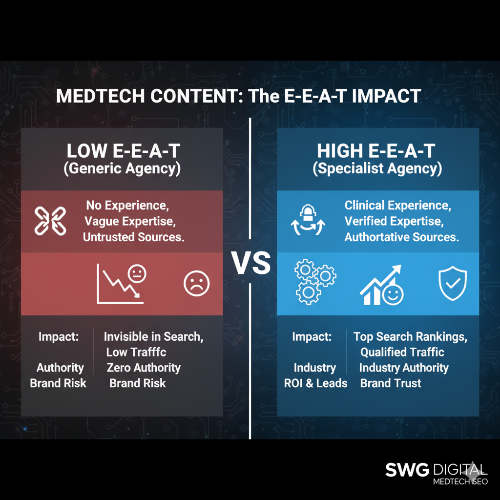 Google sees this low-E-E-A-T content and correctly identifies it as untrustworthy. As a result, your page is buried on page 10, and your investment is completely wasted. This is the fundamental disconnect in generic b2b seo services for the medtech sector.